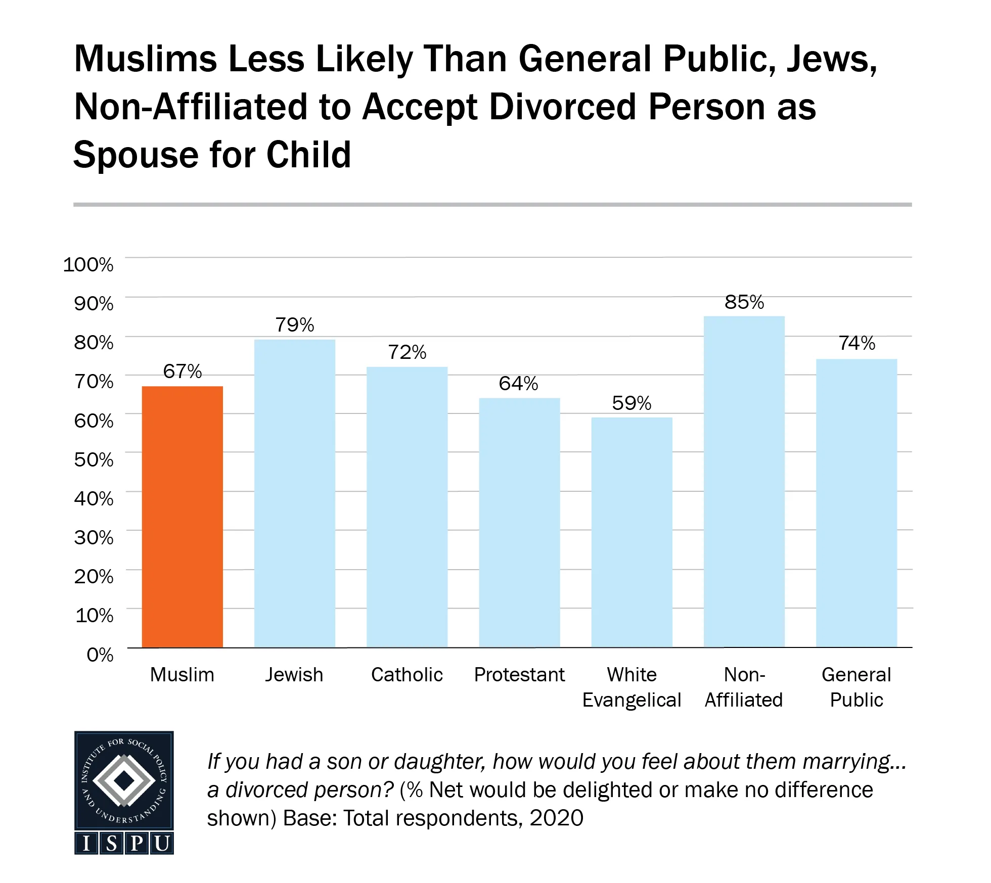A majority of Muslims (67%) say they would accept their child marrying a divorced person, more likely than white Evangelicals, on par with Protestants and Catholics, but less likely than the general public, Jews, and non-affiliated Americans. This points to the enduring reality that divorce is stigmatized and divorced people are not fully accepted by a significant swath of society, and Muslims are no exception.