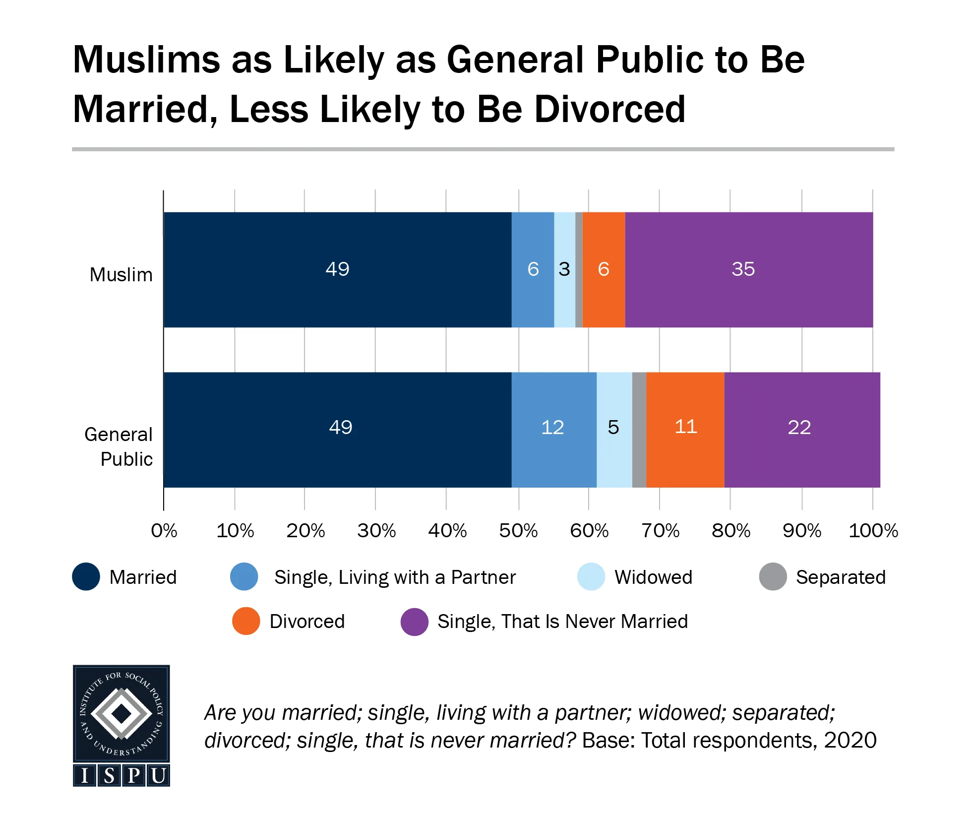1. Compared to the general public, Muslims are equally likely to be married, but are less likely to be divorced.