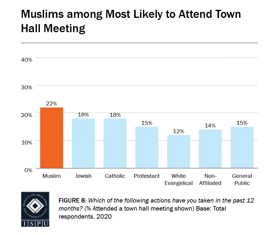 Nearly one quarter of Muslims attended a town hall meeting in the year prior to the survey (22%), compared with 15% of Protestants, 12% of white Evangelicals, 14% of the non-affiliated, and 15% of the general public. Muslims and Jews (both at 16%) are the most likely to volunteer for a political campaign in the past year, compared with 5% of Catholics, 8% of Protestants, 9% of white Evangelicals, 4% of the non-affiliated, and 7% of the general public. Finally, we asked survey respondents if they made a financial contribution to a political campaign in the past year. Muslims are on par with other groups; 21% of Muslims, 18% of Catholics, 21% of Protestants, 18% of white Evangelicals, 19% of the non-affiliated, and 19% of the general public reported that they made a campaign contribution. Jews were the most likely at 35%.