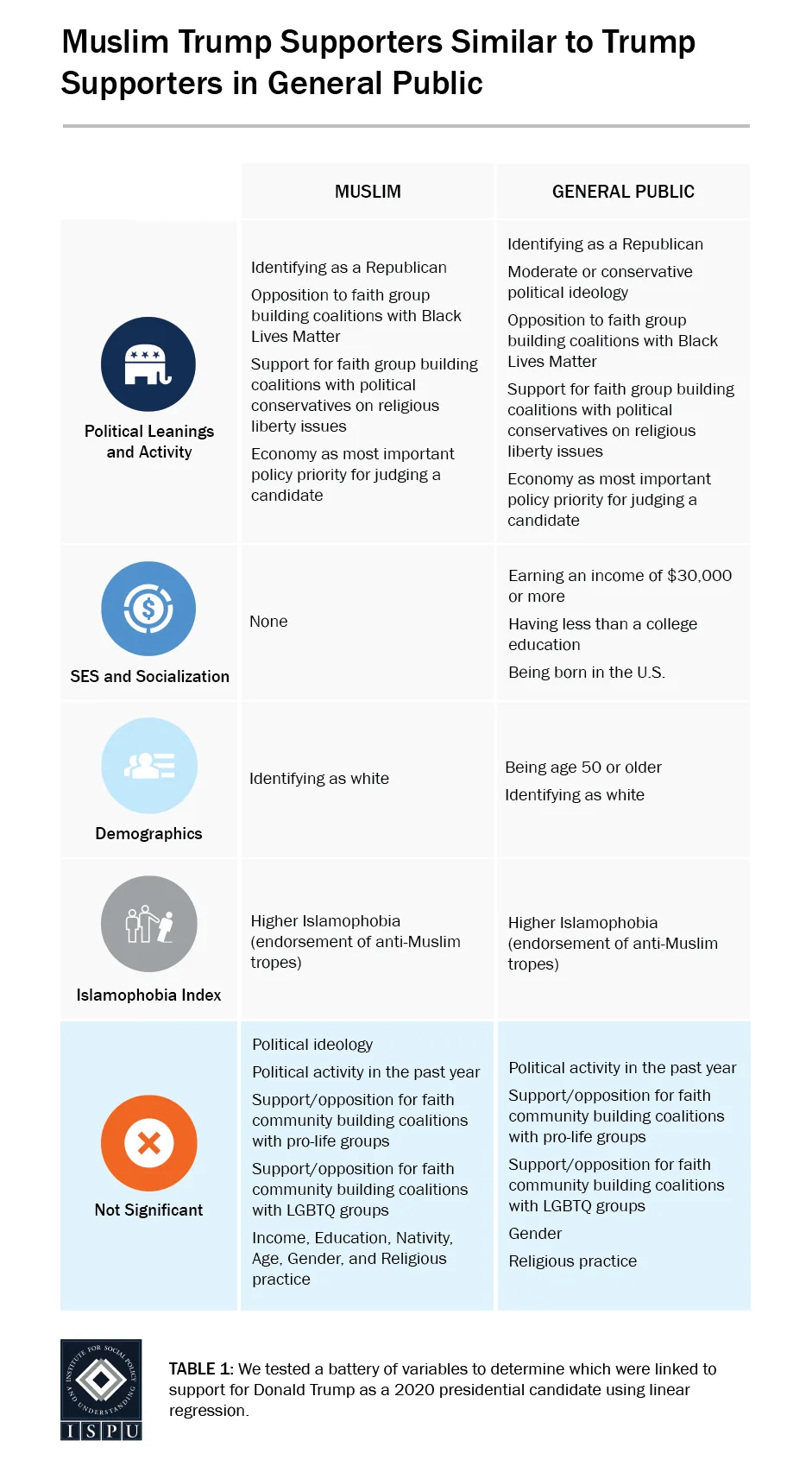 We used regression analysis to better understand Muslim and general public Americans who prefer Trump as their presidential candidate in 2020. We find similarities between the two groups. In terms of political leanings, both Muslim and general public Trump supporters are more likely to identify as Republican, oppose coalition building between their faith community and Black Lives Matter, support coalition building between their faith community and political conservatives on religious liberty issues, and prioritize the economy as their most important policy issue. Additionally, both groups of Trump supporters are more likely to identify as white. Notably, Muslim and general public Trump supporters are also more likely to endorse anti-Muslim tropes.