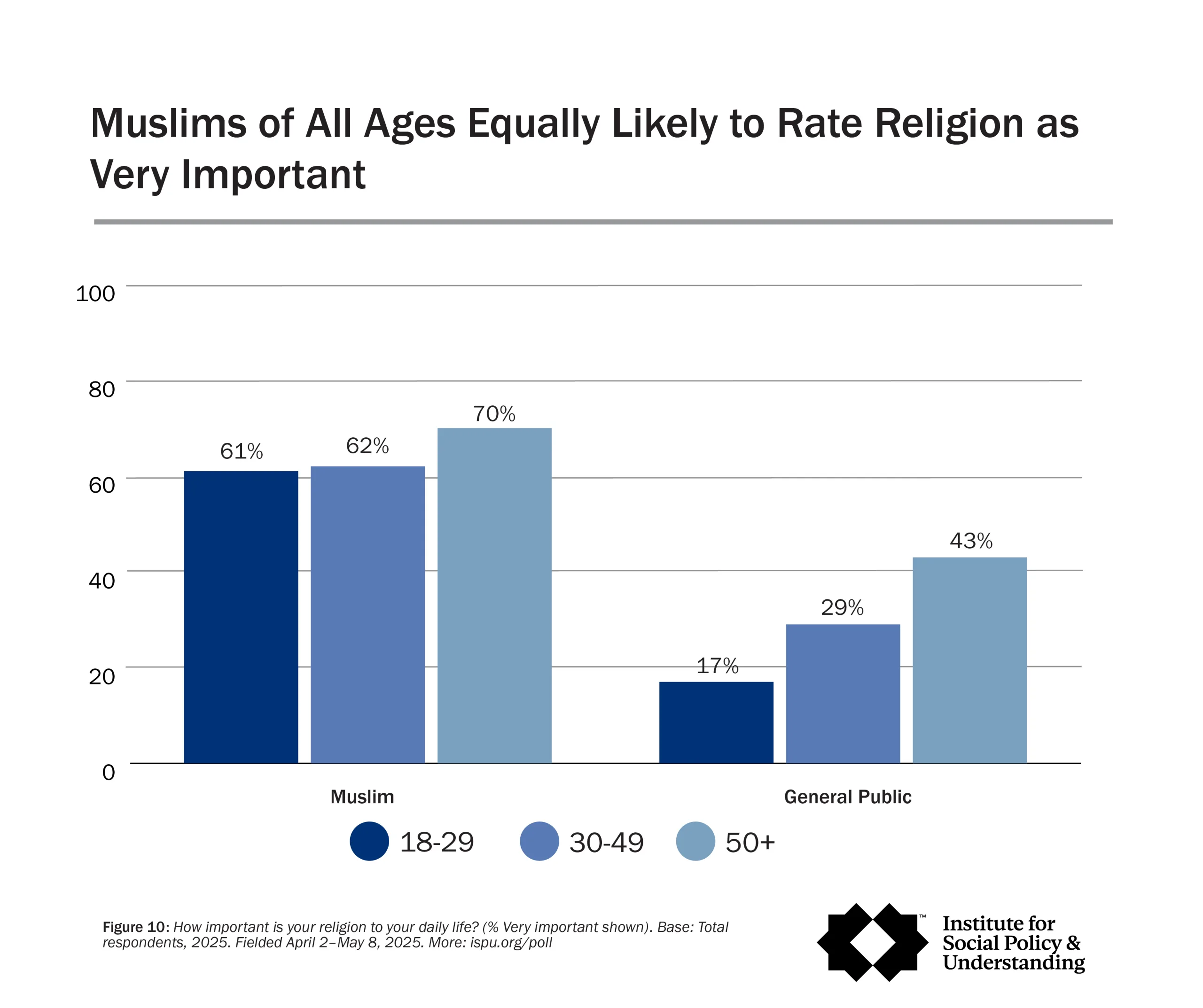 As found in all prior American Muslim Polls, Muslims of all ages are equally likely to rate religion as very important to daily life. This includes 61% of 18-to-29-year-olds, 62% of 30-to-49-year-olds, and 70% of Muslims ages 50+. On the other hand, among the general public, rating religion as very important differs by age, with older people being the most likely (17% of 18-to-29-year-olds, 29% of 30-to-49-year-olds, and 43% of those 50+).