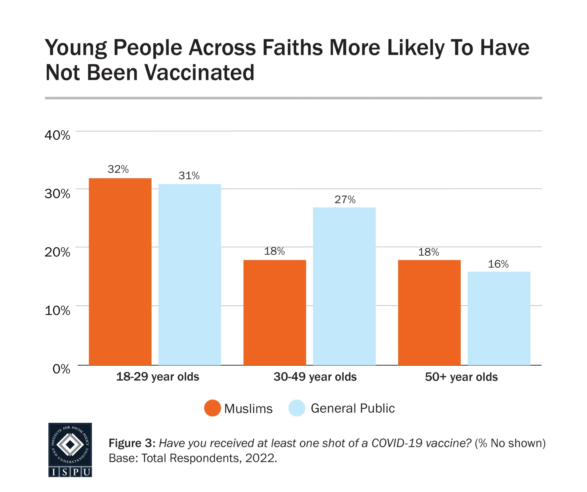 Bar graph showing that young people aged 18-29, among Muslims and the General Public, are more likely to report not being vaccinated.