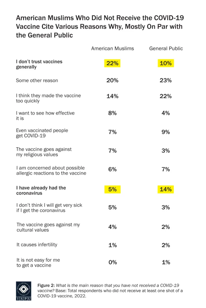 • Among those who did not receive the COVID-19 vaccine, American Muslims were more likely than the general public to cite a general distrust of vaccines as the reason (22% vs. 10%).