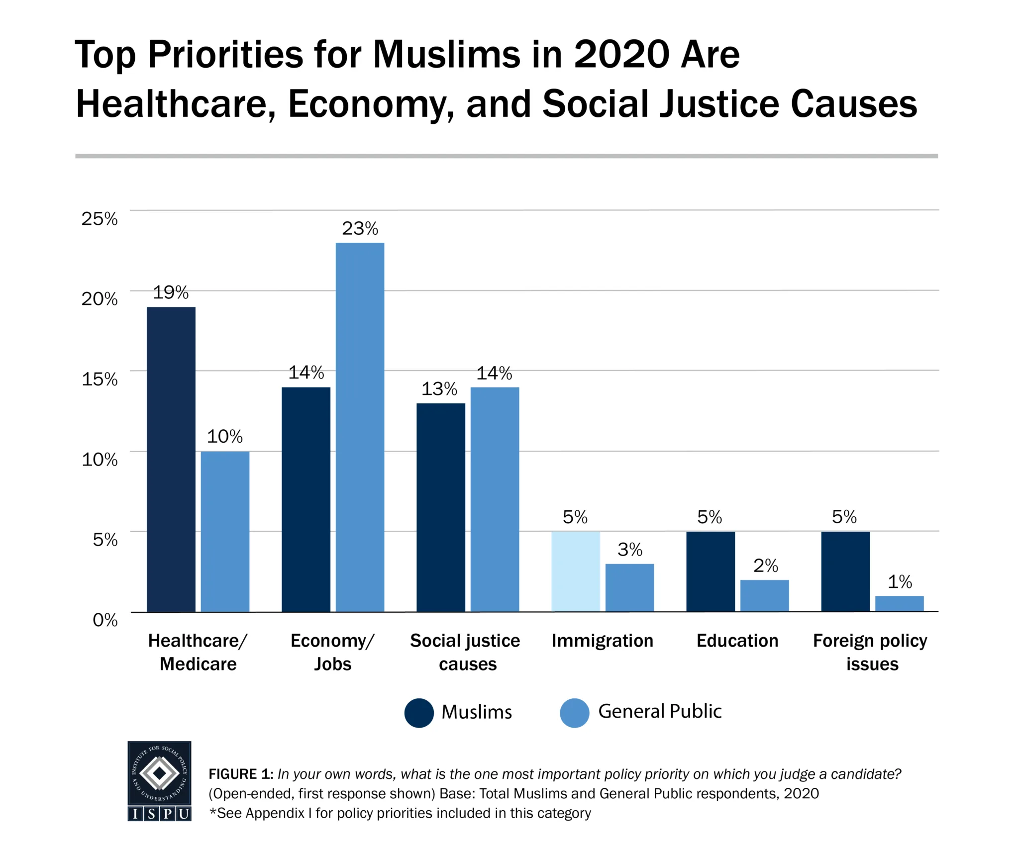 This suggests that the war in Gaza, which tops Muslim concerns, may have galvanized Muslims toward greater civic engagement. This assertion is further supported when considering national Muslim respondents’ response to an open-ended question asking them about the policy priorities they consider when judging a candidate in 2020. Healthcare (19%), economy and jobs (14%), and social justice causes (13%) topped the list, with “foreign policy issues” trailing at 5%. Not only did Muslims and the general public not differ dramatically on their priorities with the economy (23%), healthcare (10%), and social justice issues (14%) also topping the list for the general public, but no issue dominated the list for either group. That is in sharp contrast to 2024 where the majority of Muslims (61%) across three swing states cite the war in Gaza as a key issue on which they will judge a candidate–without a close second.