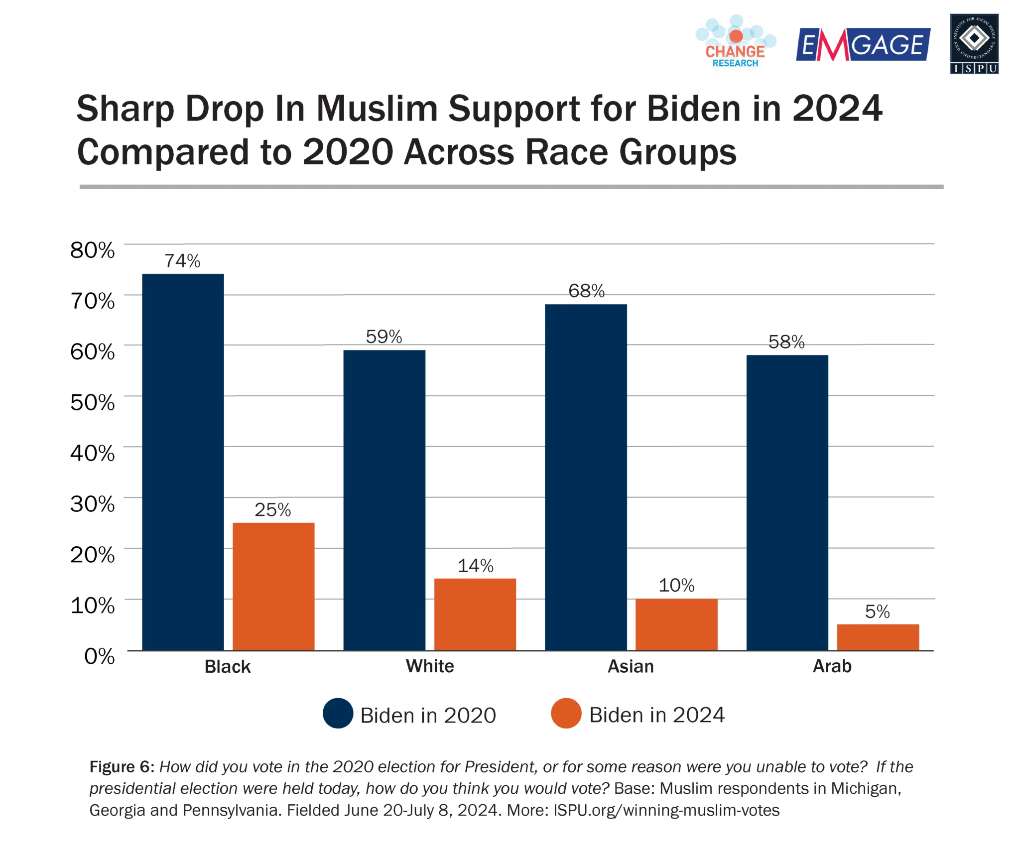 - By race, this breaks down as 14% of white, 25% Black, 10% Asian, and 5% Arab Muslims who intended to vote for Biden in 2024.