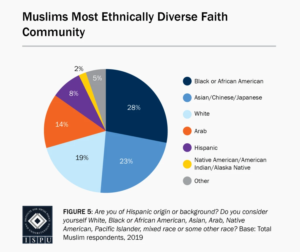 It remains an open question whether interracial marriage is associated with a narrowing of social distance between Muslims and the broader society, a phenomenon commonly referred to as “integration” or “assimilation.” To be sure, recent scholarship has cast doubt on the link between intermarriage and assimilative attitudes. Regardless, the patterns we observe in our data underscore a quintessentially American Muslim experience—reflecting, as they do, the community’s unmatched racial diversity (Figure 5) relative to any other country’s Muslim population. This demographic reality will doubtless affect whatever form “American Islam” takes in the years to come.