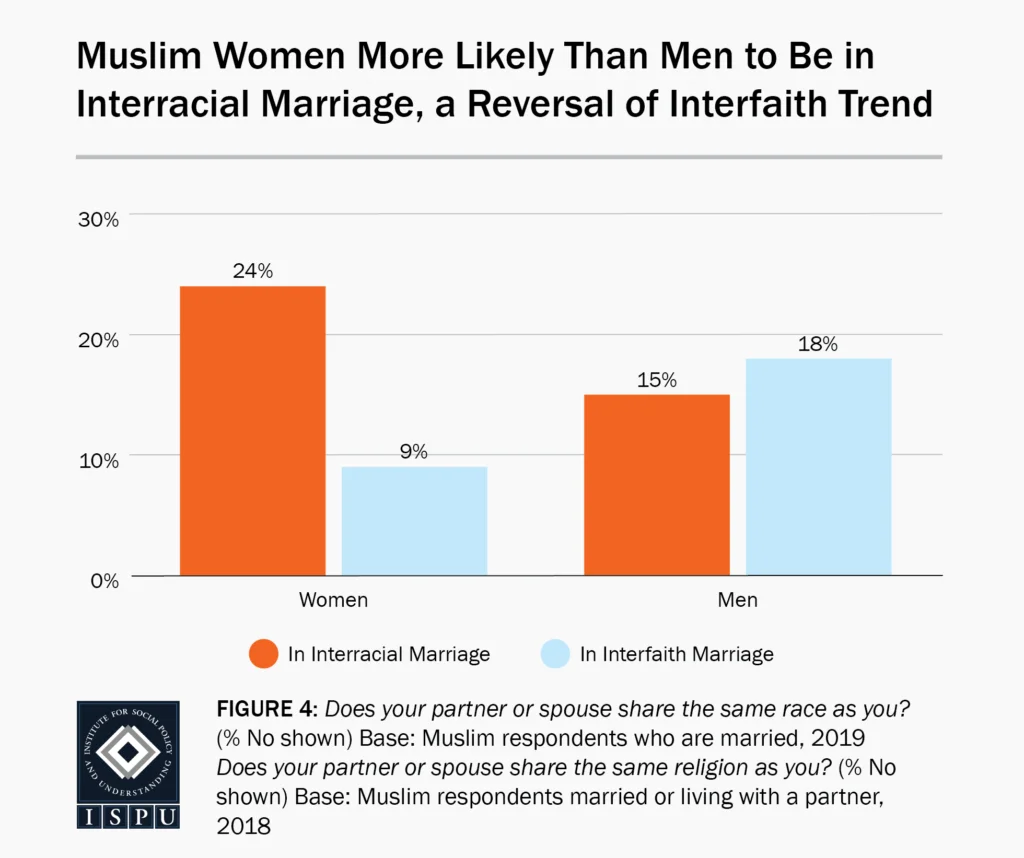Another notable demographic discrepancy exists between men’s and women’s rates of interracial marriage. Figure 4 shows that women are about 9 percentage points more likely than men to marry someone of a different race, although this finding is not statistically significant. In the general public, only among Asian Americans are women more likely than men to marry someone of a different racial background. This gender gap once again inverts the trend we witnessed last year in our analysis of interfaith marriage, when we observed that Muslim women were only about half as likely as men to wed someone outside their faith.