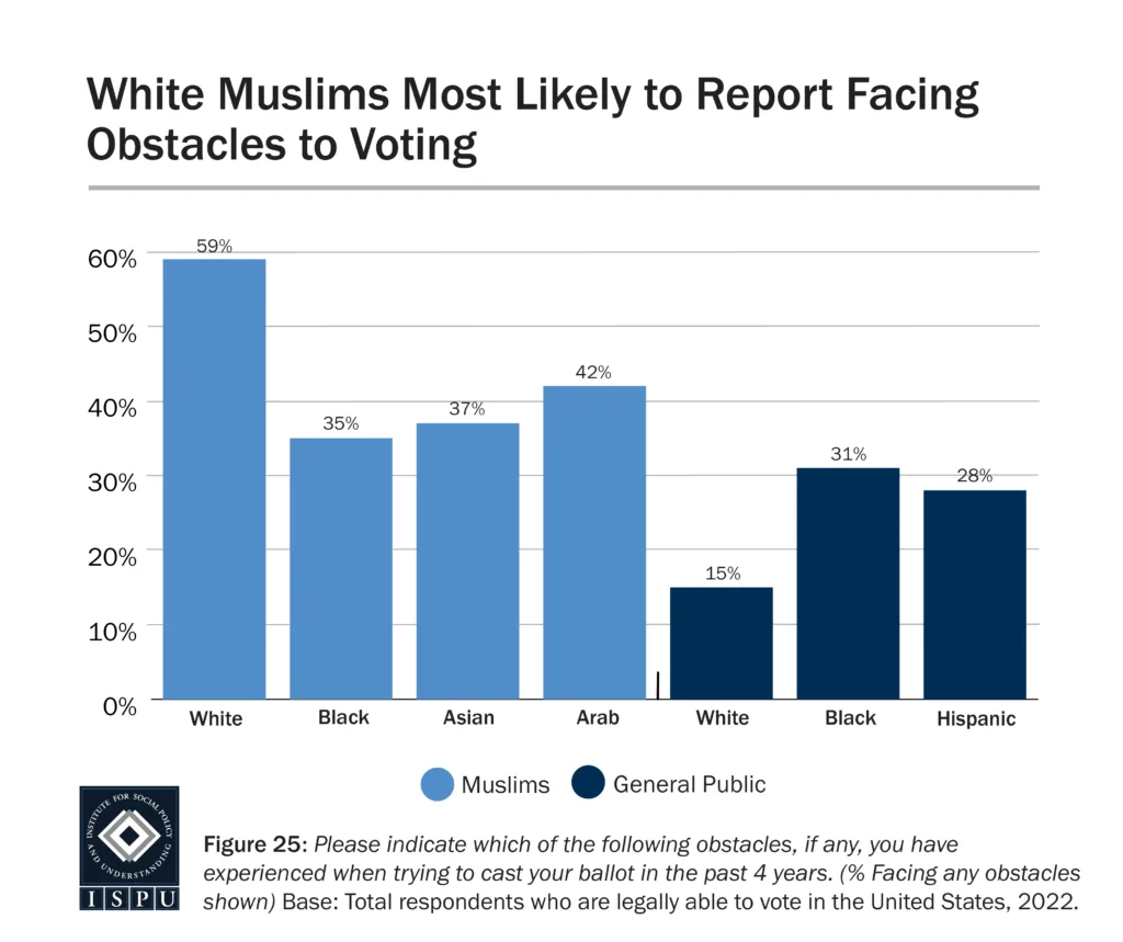 Though converts (95%) are more likely than born Muslims (75%) to be eligible to vote, among those who are eligible, converts (78%) are as likely as born Muslims (82%) to be registered to vote. However, converts (71%) are more likely than born Muslims (48%) to have faced no obstacles when trying to vote in the previous four years (since 2022). Previously published ISPU data that younger Muslims are more likely than older Muslims to report facing obstacles and white Muslims are more likely than non-white Muslims to report facing obstacles may help to provide context on this finding. In terms of political partisanship, converts and born Muslims are similar. Nine percent of converts are Republican, on par with 11% of born Muslims. Additionally, 41% of converts are Democrats, on par with 48% of born Muslims. Finally, 40% of both convert and born Muslims are independents.