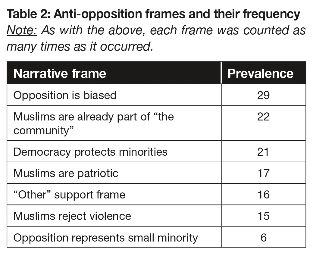 In several of the cases analyzed, there were clear narrative frames used by anti-opposition groups that sought to combat mosque opposition. Supportive arguments used to defend mosque-building were made by parties proposing mosque construction as well as allies. These positive narrative frames and their prevalence were as follows.