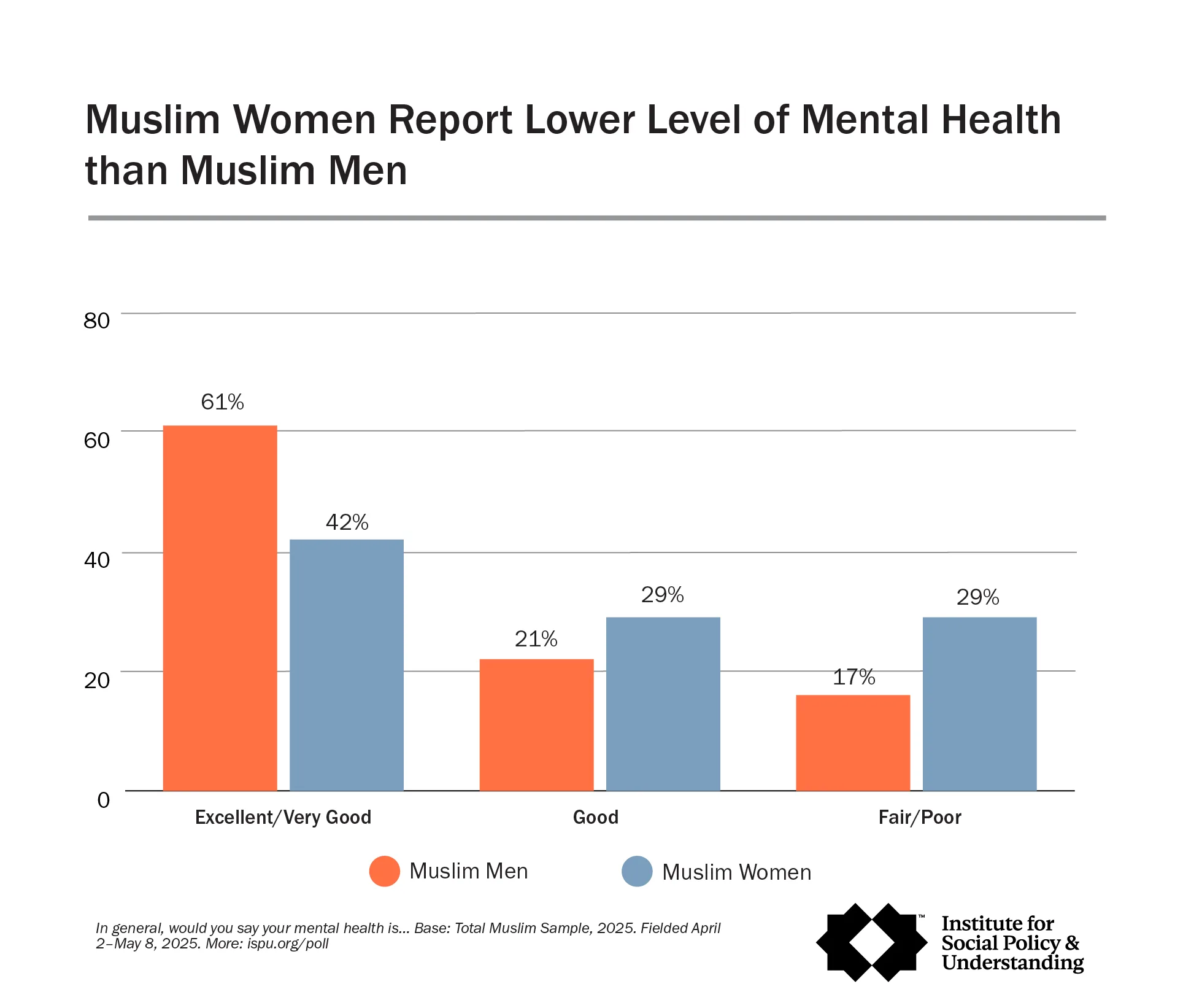This analysis uses data from ISPU’s American Muslim Poll 2025 to provide nationally representative data on Muslims in the United States regarding mental health to inform and support the work being done to improve outcomes for Muslims across the country. The full methodology is available here. We explore differences by gender, age, and race/ethnicity, based on prior research showing demographic differences in prevalence and experience of mental health conditions and treatment seeking.